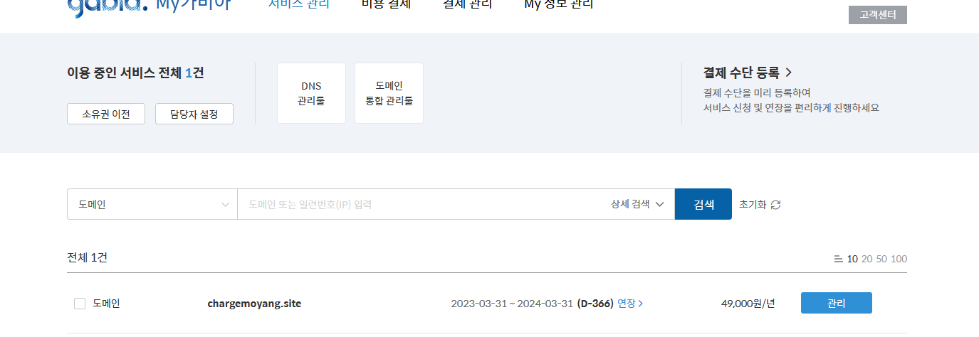 무료 도메인을 사용할까 하다가 이왕 하는 김에 조금이라도 예쁜 도메인을하기 위해 할인하고 있는 것으로 구매하였다.