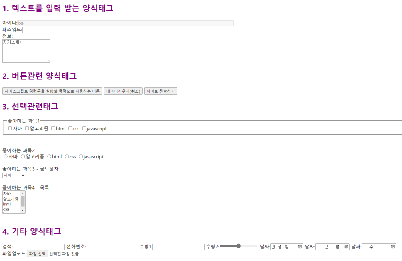 - 사용자가 입력한 내용을 서버로 전송하기 위해 사용하는 태그(양식태그, 입력태그, 폼태그...)