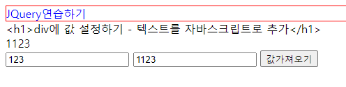 $("#result").text("<h1>div에 값 설정하기 - 텍스트를 자바스크립트로 추가</h1>");