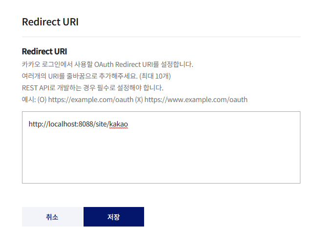 Redirect URI의 주소는 본인이 원하는 주소로 설정하면 됩니다. 저는 /프로젝트명/kakao로 했으나 /aouth, /login 등 자유롭게 설정해주세요.