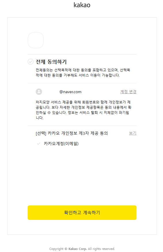 사용자가 카카오 로그인 버튼을 누르면 카카오 인증 서버는 동의 항목 선택창을 불러옵니다. 사용자가 동의 항목을 선택하고 "확인하고 계속하기" 버튼을 누르게 되면 서비스 서버는 인가 코드를 받게 되고, 받아온 이 인가 코드로 토큰을 발급받습니다. 서비스 서버가 갖고 있는 토큰으로 카카오 인증 서버에서 토큰을 통해 사용자 정보를 조회하고 회원가입/로그인 처리를 진행하게 됩니다.